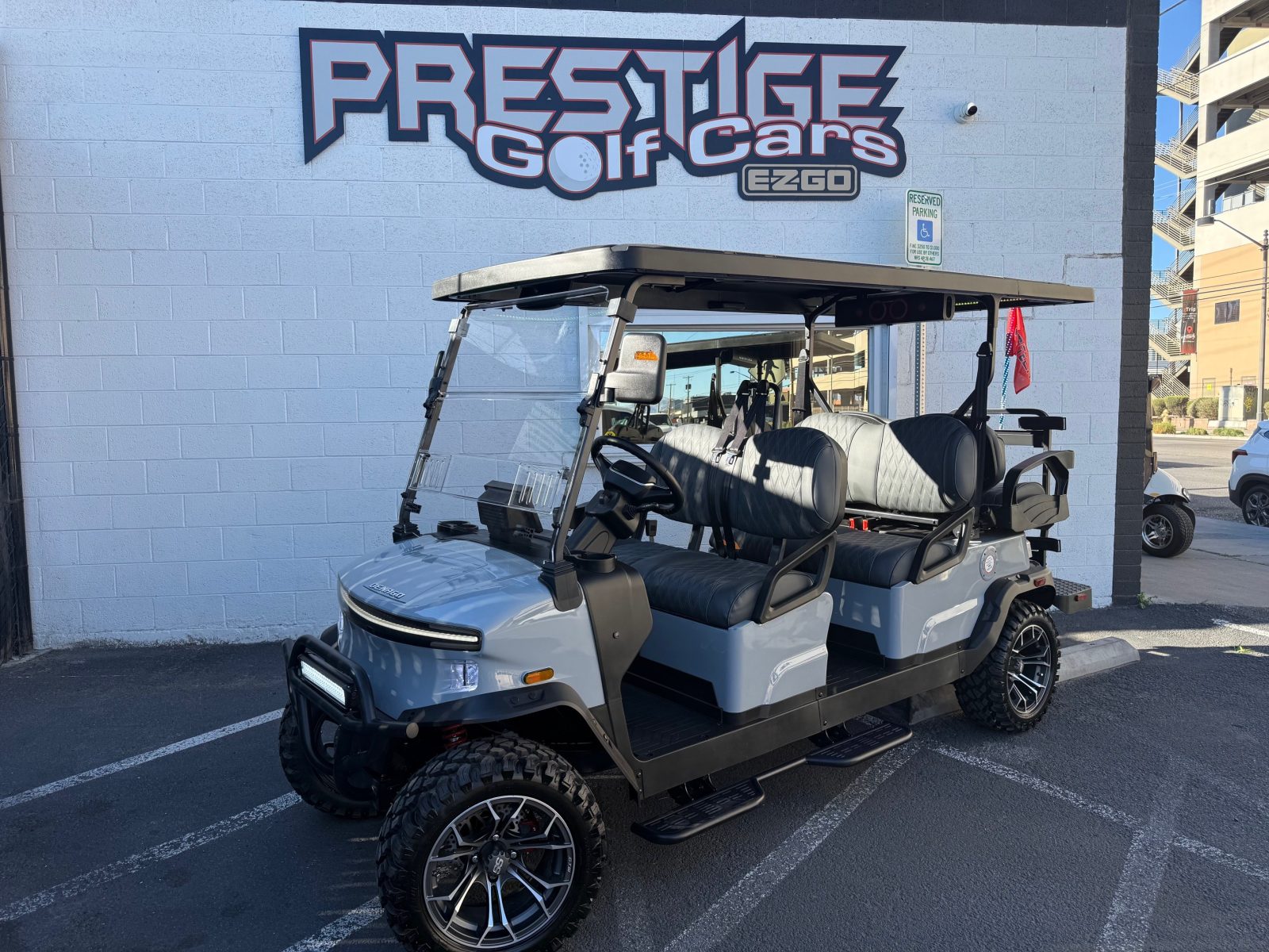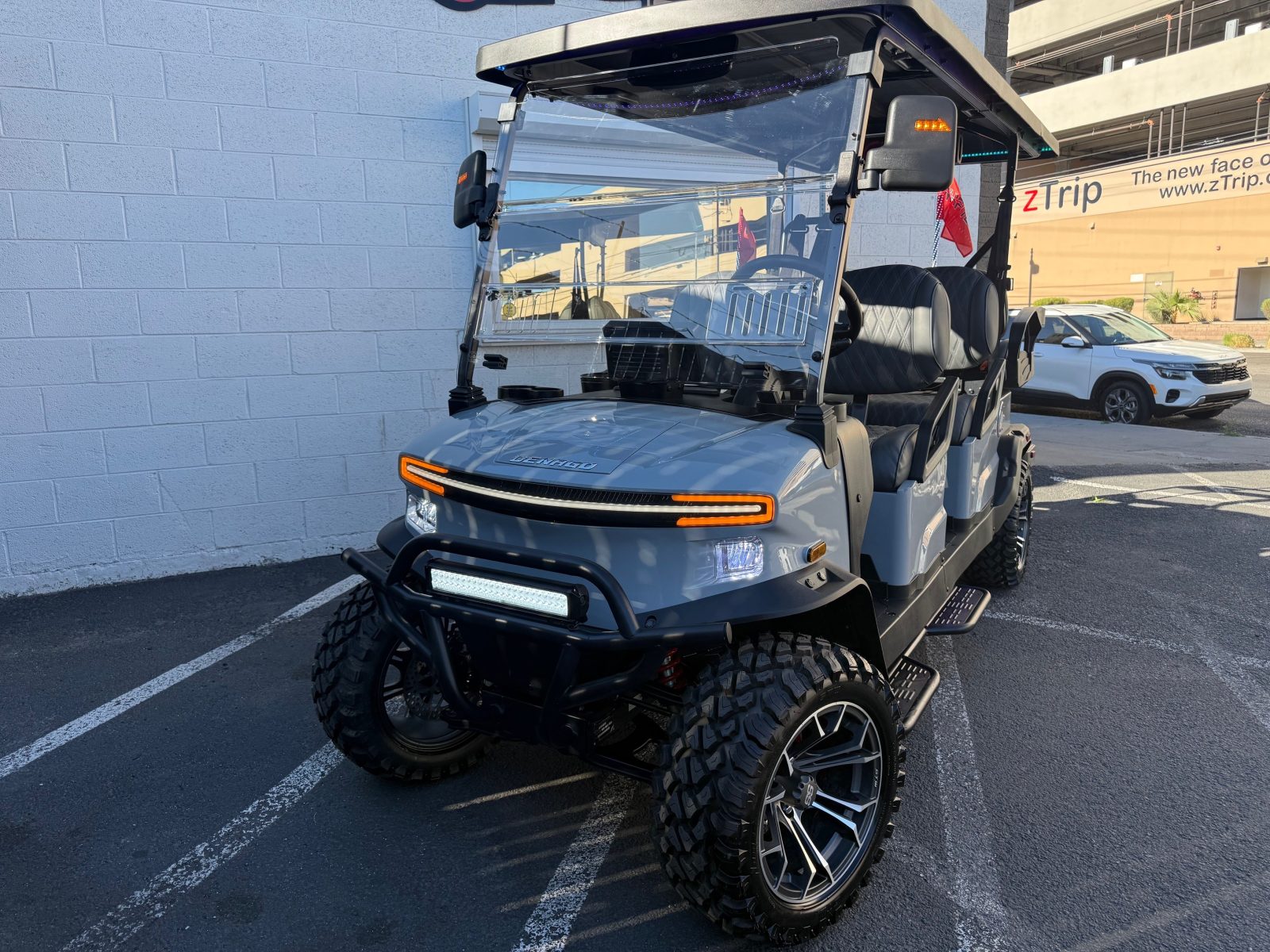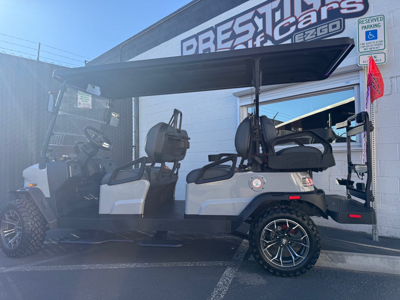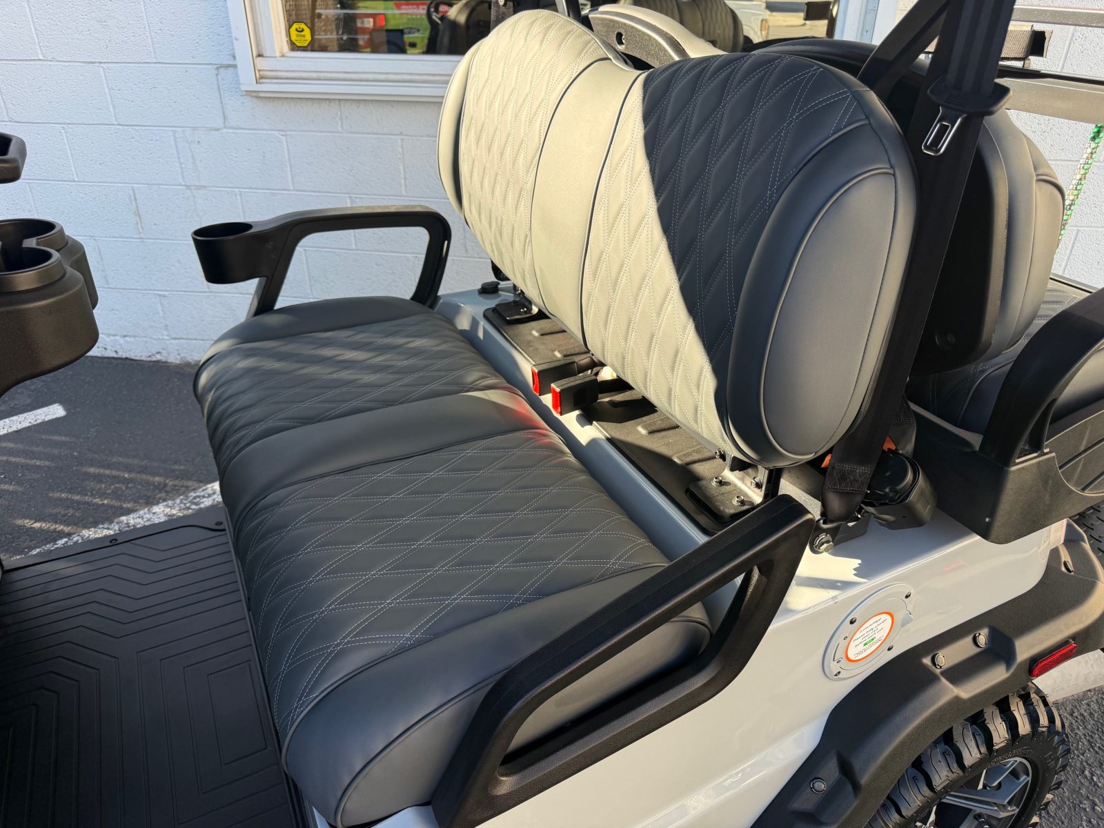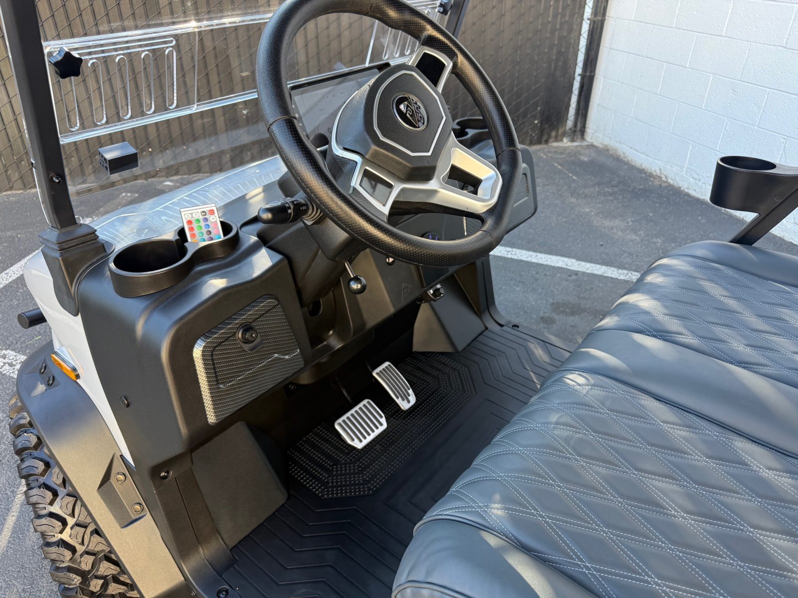 Well equipped with long top & folding windshield with air vents, LED lights, LED light bar, custom tilt steering wheel, back-up camera, display screen, side mirrors w/ LED, rear view mirror, seat belts, turn signals, upgraded premium seats, locking glove box, dual USB charging ports, canopy safety handles, front storage compartment, under front seat storage compartment, flip folding rear seat with under seat storage tray, golf bag attachments, lift kit, aftermarket 15″ alloy wheels, nerf bars, Bluetooth sound bar, Bluetooth speakers w/ Apple CarPlay/Android Auto, custom 8″ sub with amp, reducer, 4′ LED whip, LED underglow kit under canopy and cart and so much more.
