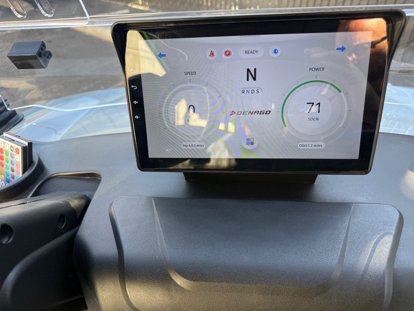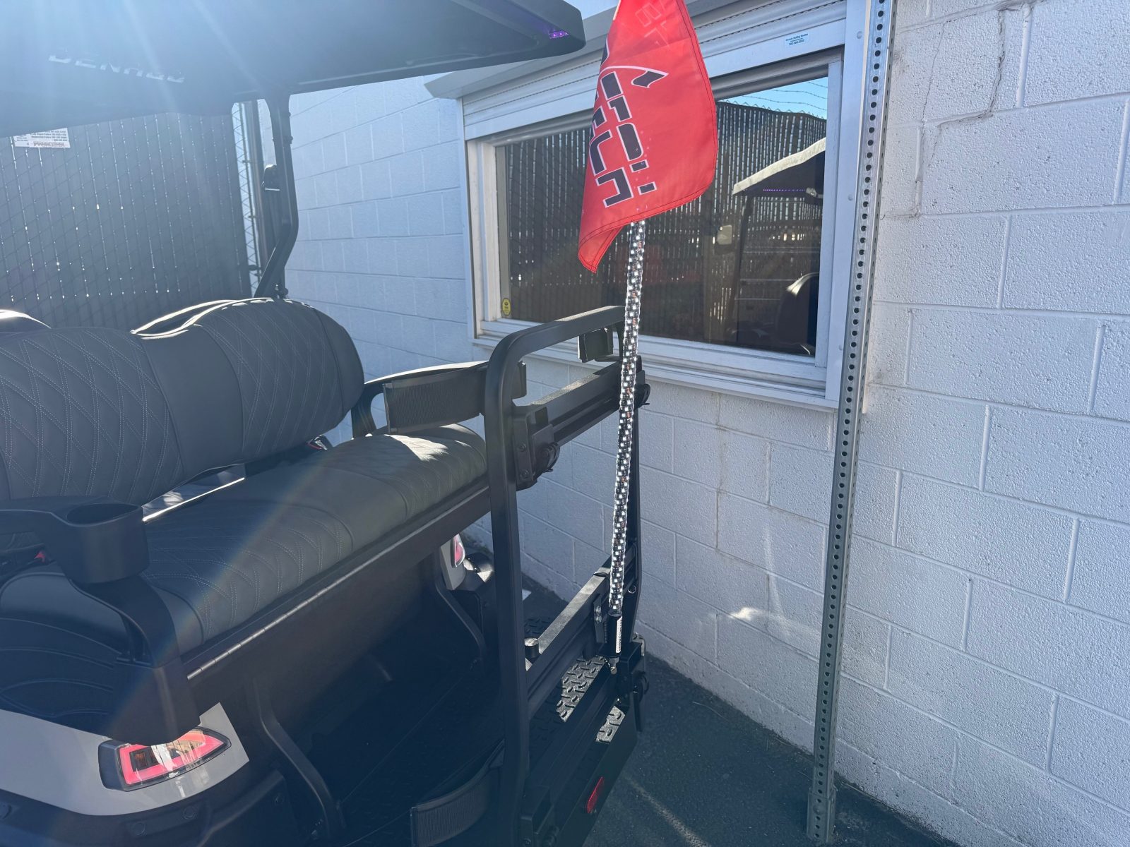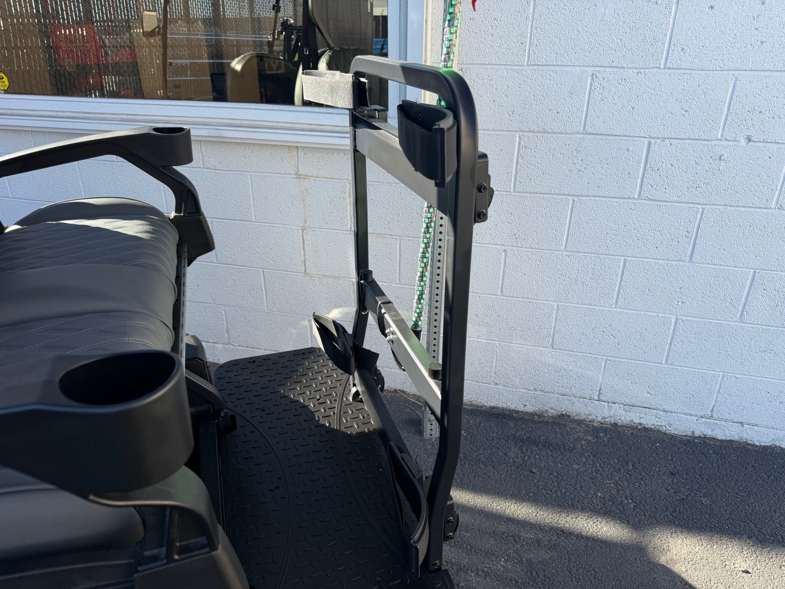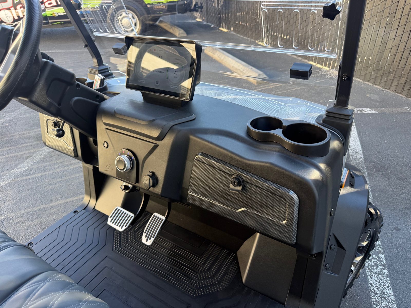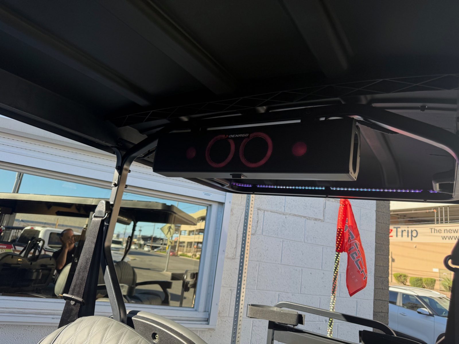 Well equipped with long top & folding windshield with air vents, LED lights, LED light bar, custom tilt steering wheel, back-up camera, display screen, side mirrors w/ LED, rear view mirror, seat belts, turn signals, upgraded premium seats, locking glove box, dual USB charging ports, canopy safety handles, front storage compartment, under front seat storage compartment, flip folding rear seat with under seat storage tray, golf bag attachments, lift kit, aftermarket 15″ alloy wheels, nerf bars, Bluetooth sound bar, Bluetooth speakers w/ Apple CarPlay/Android Auto, custom 8″ sub with amp, reducer, 4′ LED whip, LED underglow kit under canopy and cart and so much more.