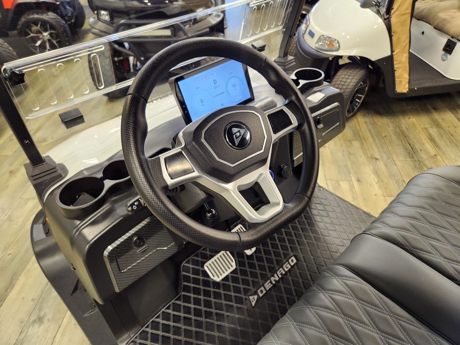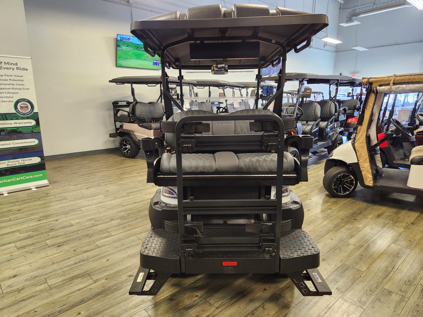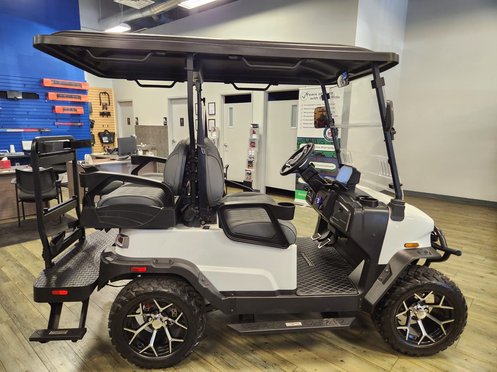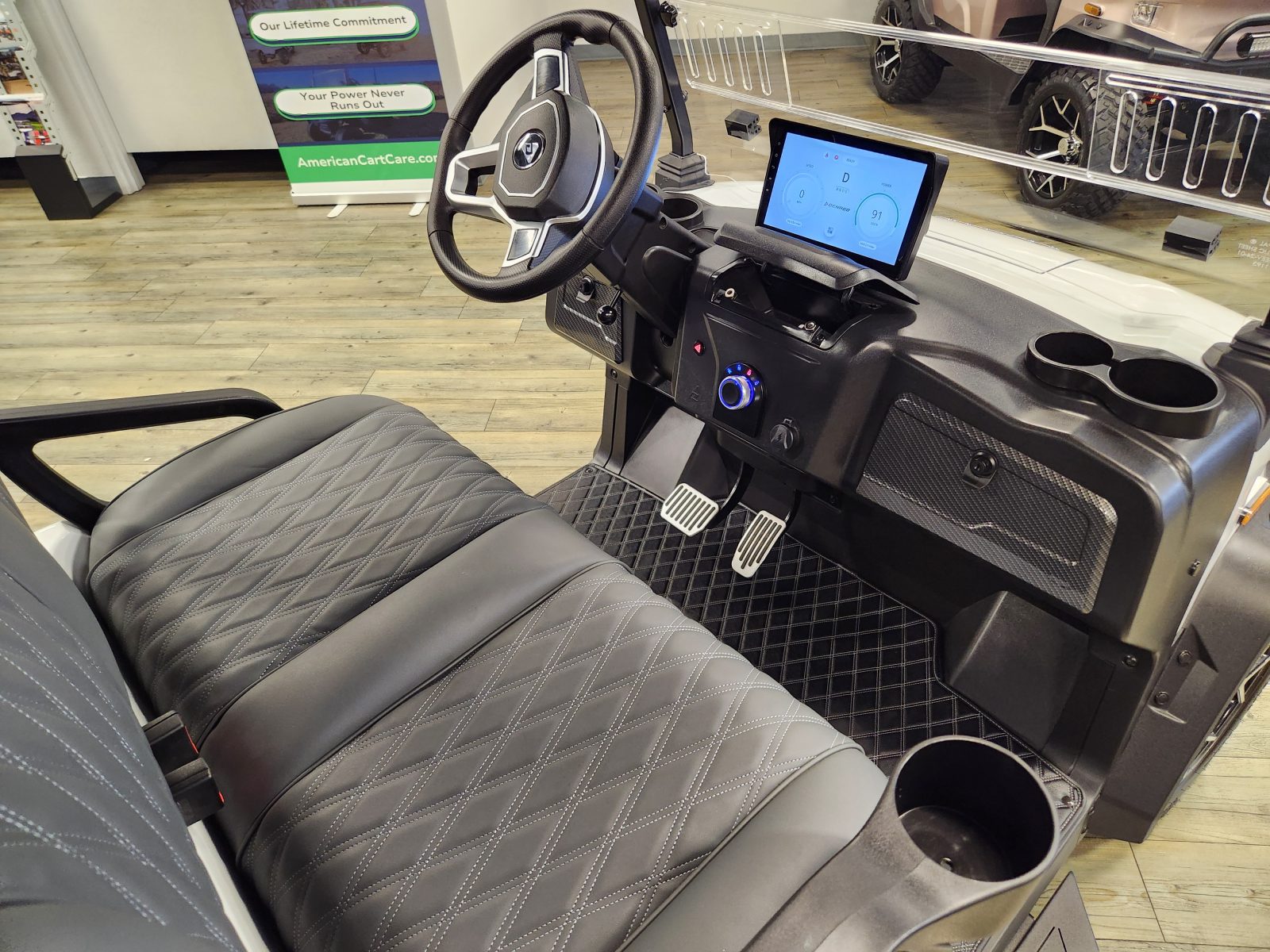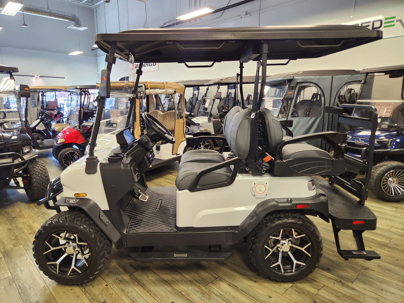 Well equipped with LED lights, LED light bar, custom tilt steering wheel, back-up camera, display screen, side mirrors w/ LED, rear view mirror, seat belts, turn signals, flip folding rear seat kit w/ under seat storage bucket, upgraded premium seats w/ arm rests, locking glove box, dual USB charging ports, canopy safety handles, front storage compartment, golf bag attachments, lift kit, alloy wheels, Bluetooth soundbar and speakers w/ Apple Car Play/Android Auto, GcartPro Side Steps, GcartPro rear steps, LED Under glow kit and so much more.