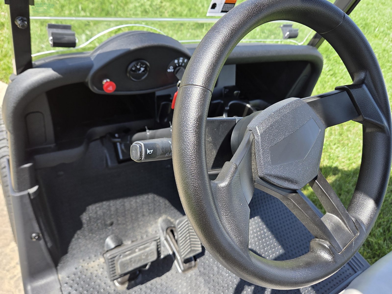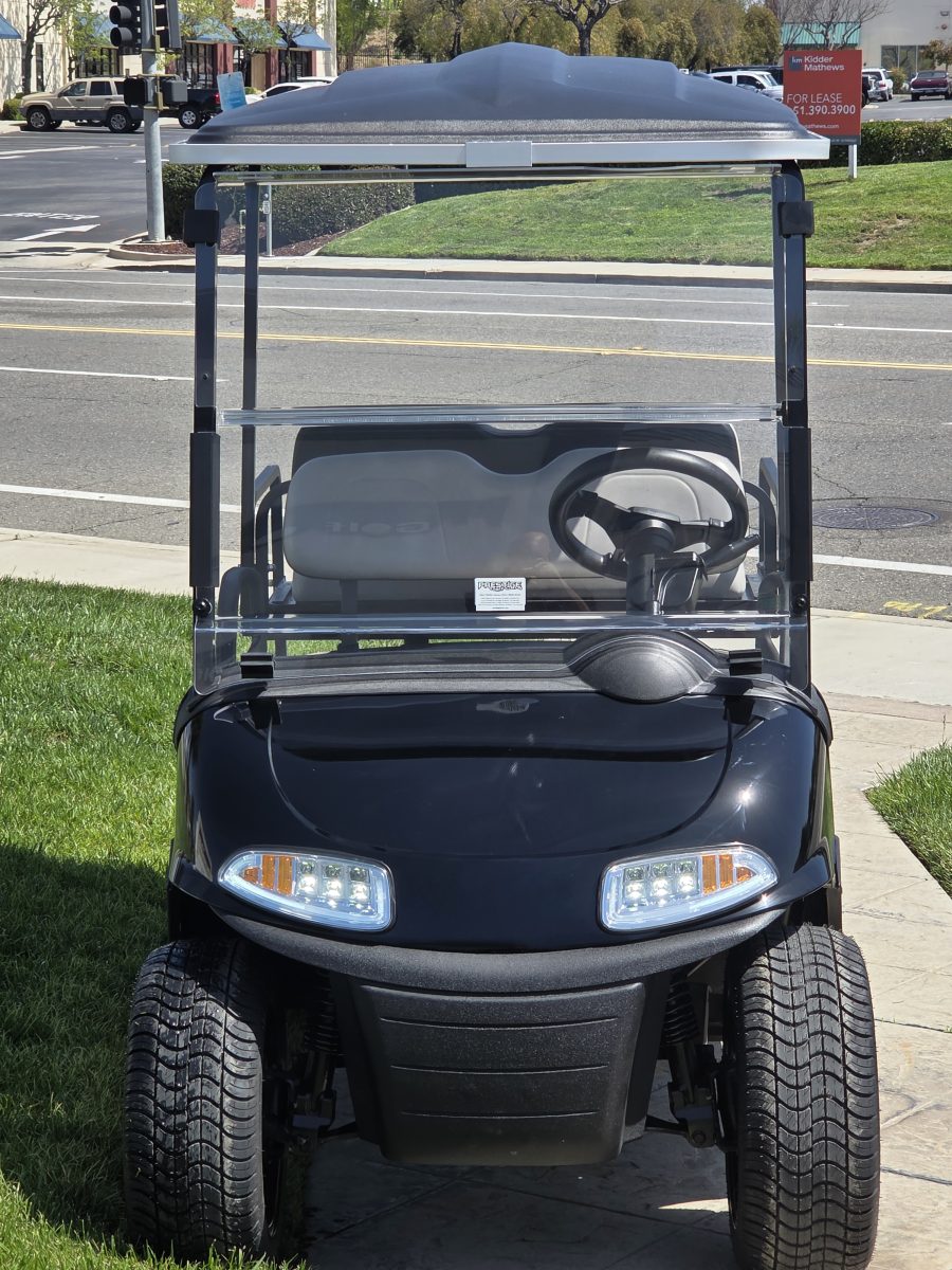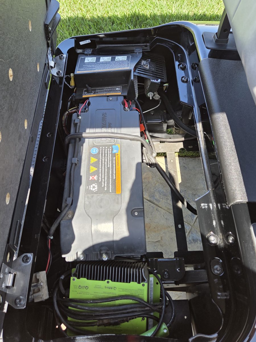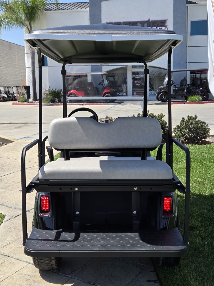 Well equipped with AC motor for great hill climbing ability, electronic braking system, long top & new folding windshield, 3 year warranty on factory Samsung battery & 1 year parts warranty on cart, new body, new rocker panels, new floor mat, brake lights, horn, turn signals, LED lights, dual USB charging ports, new seats, new upgraded custom 14″ alloy wheels & tires and so much more.