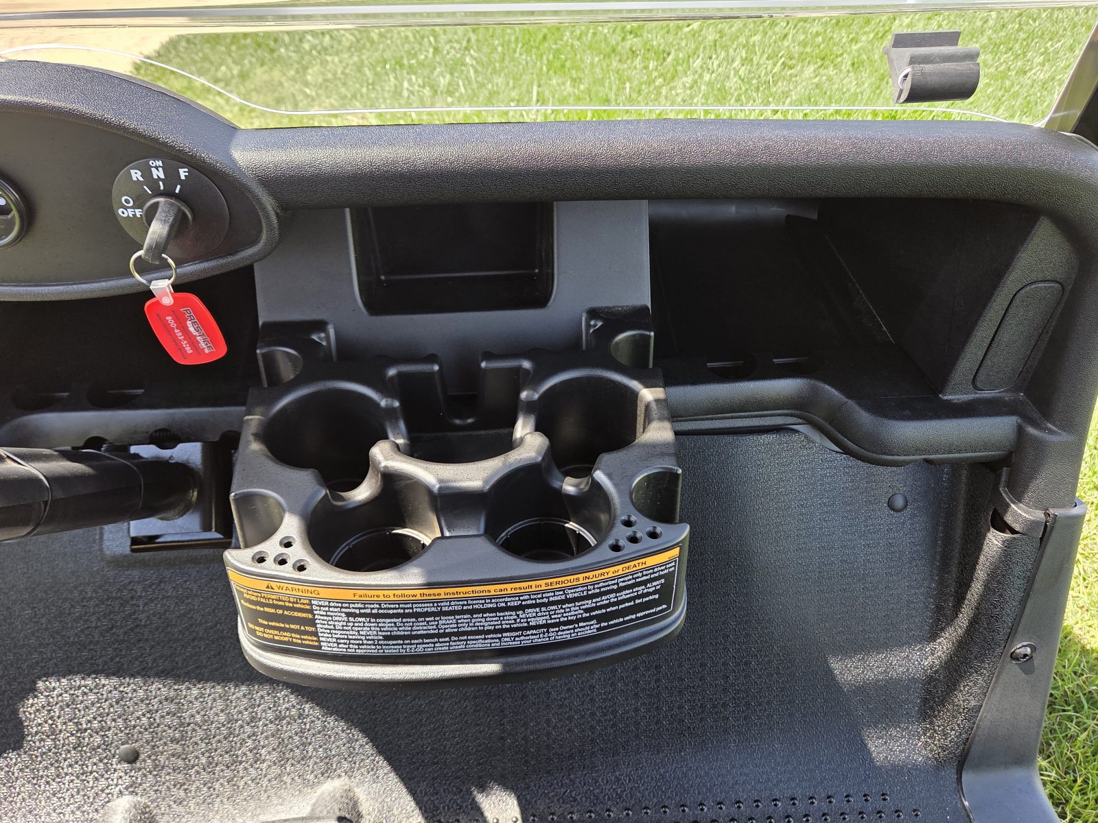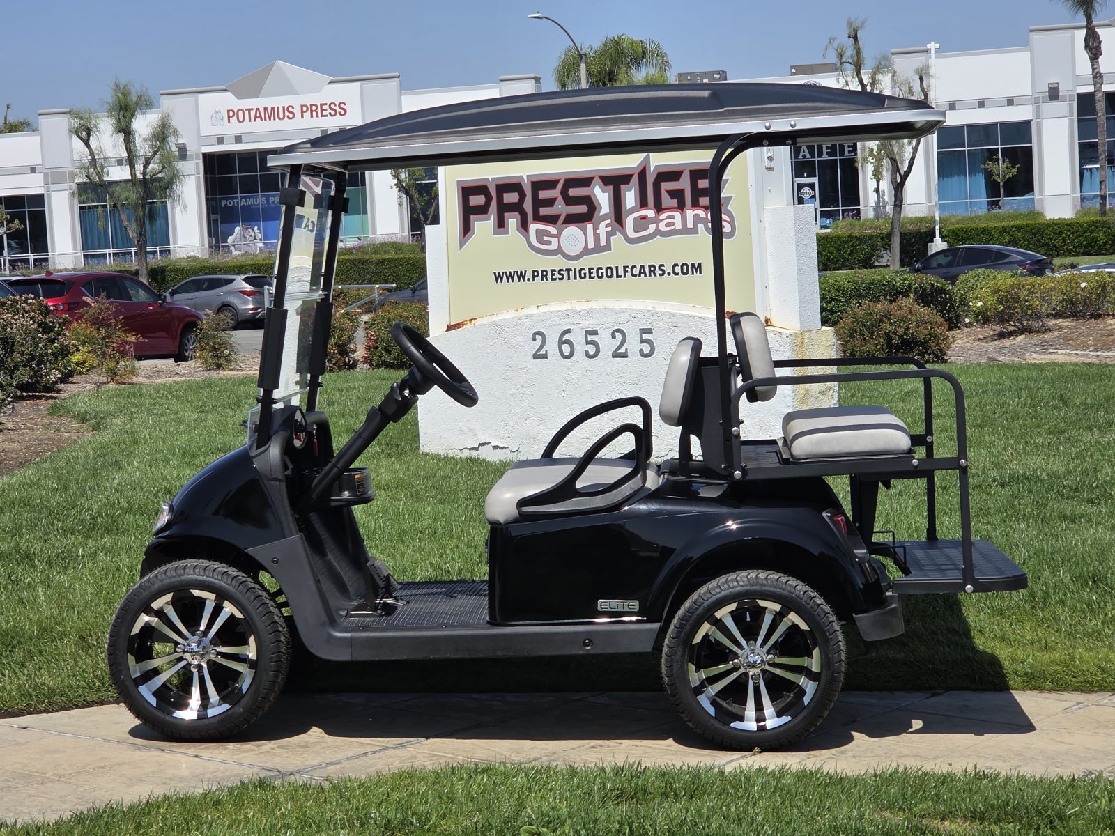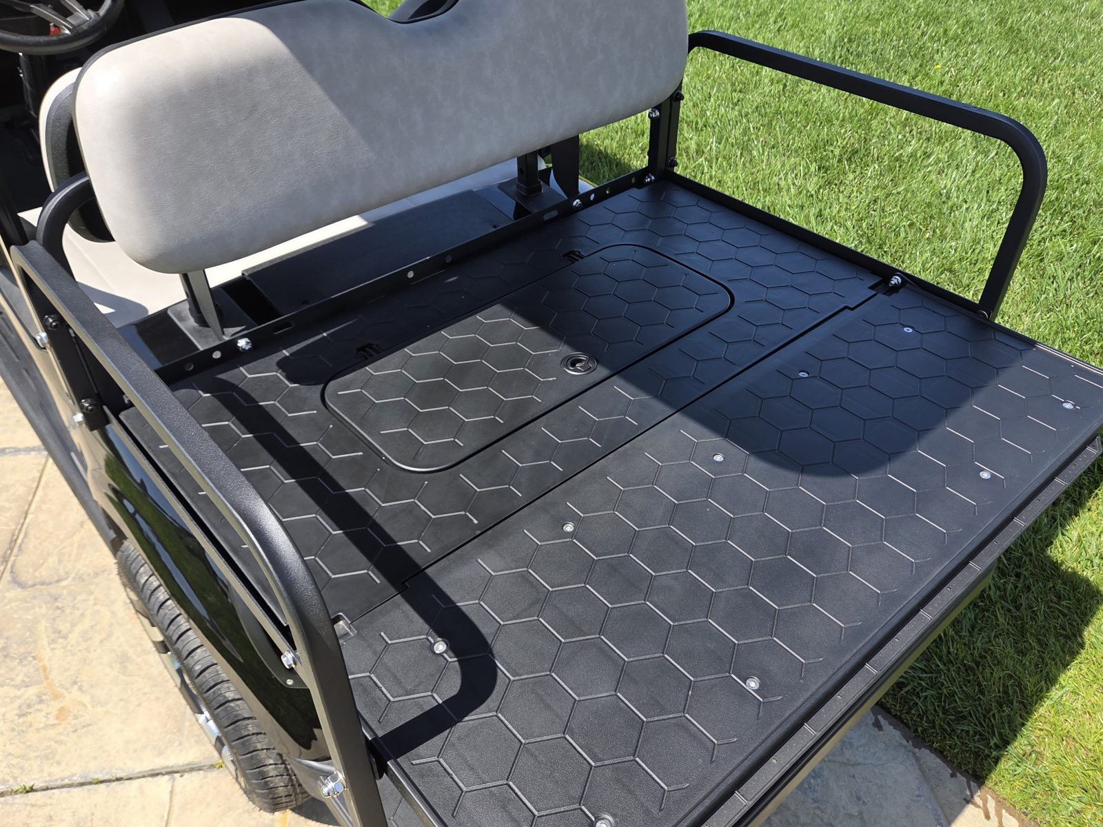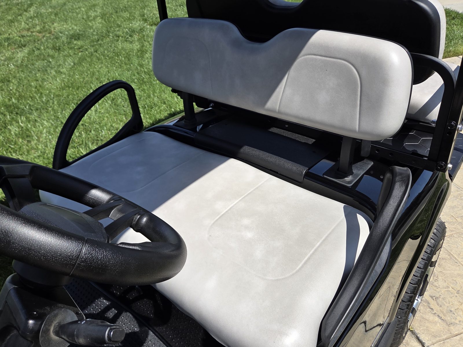Well equipped with AC motor for great hill climbing ability, electronic braking system, long top & new folding windshield, 3 year warranty on factory Samsung battery & 1 year parts warranty on cart, new body, new rocker panels, new floor mat, brake lights, horn, turn signals, LED lights, dual USB charging ports, new seats, new upgraded custom 14″ alloy wheels & tires and so much more.