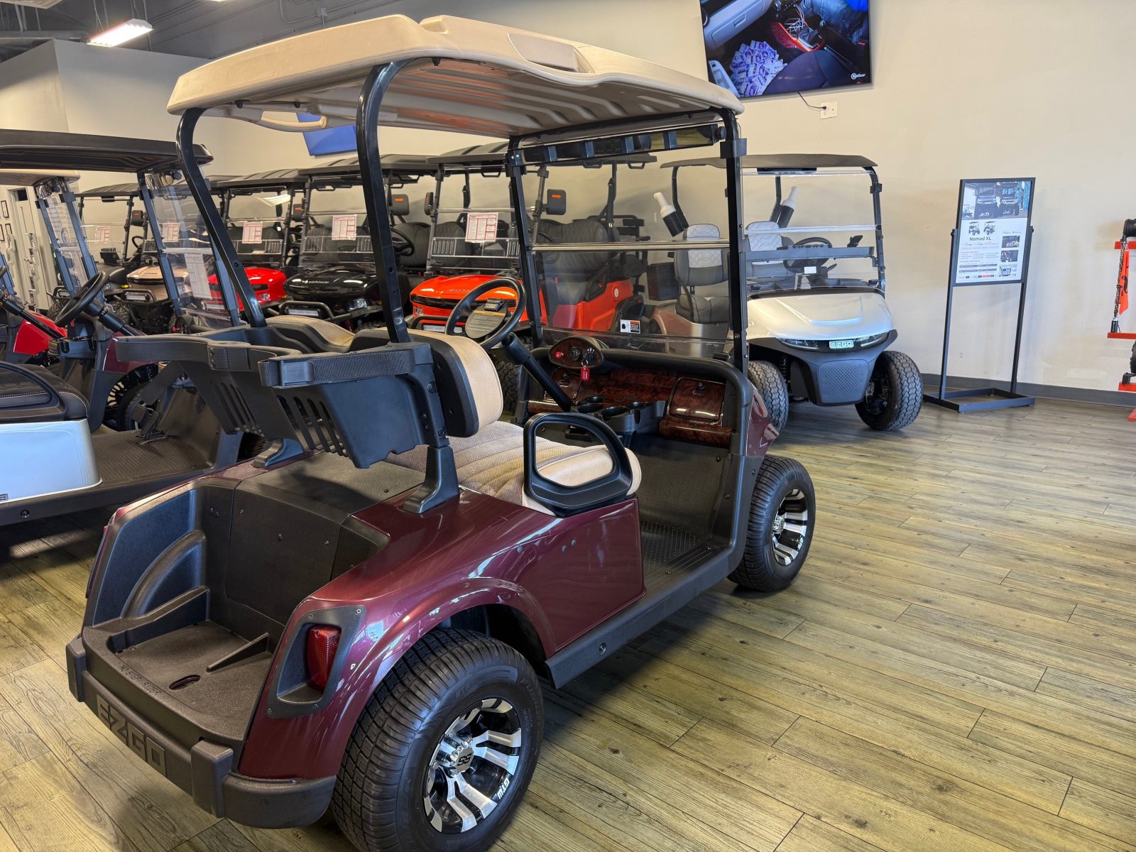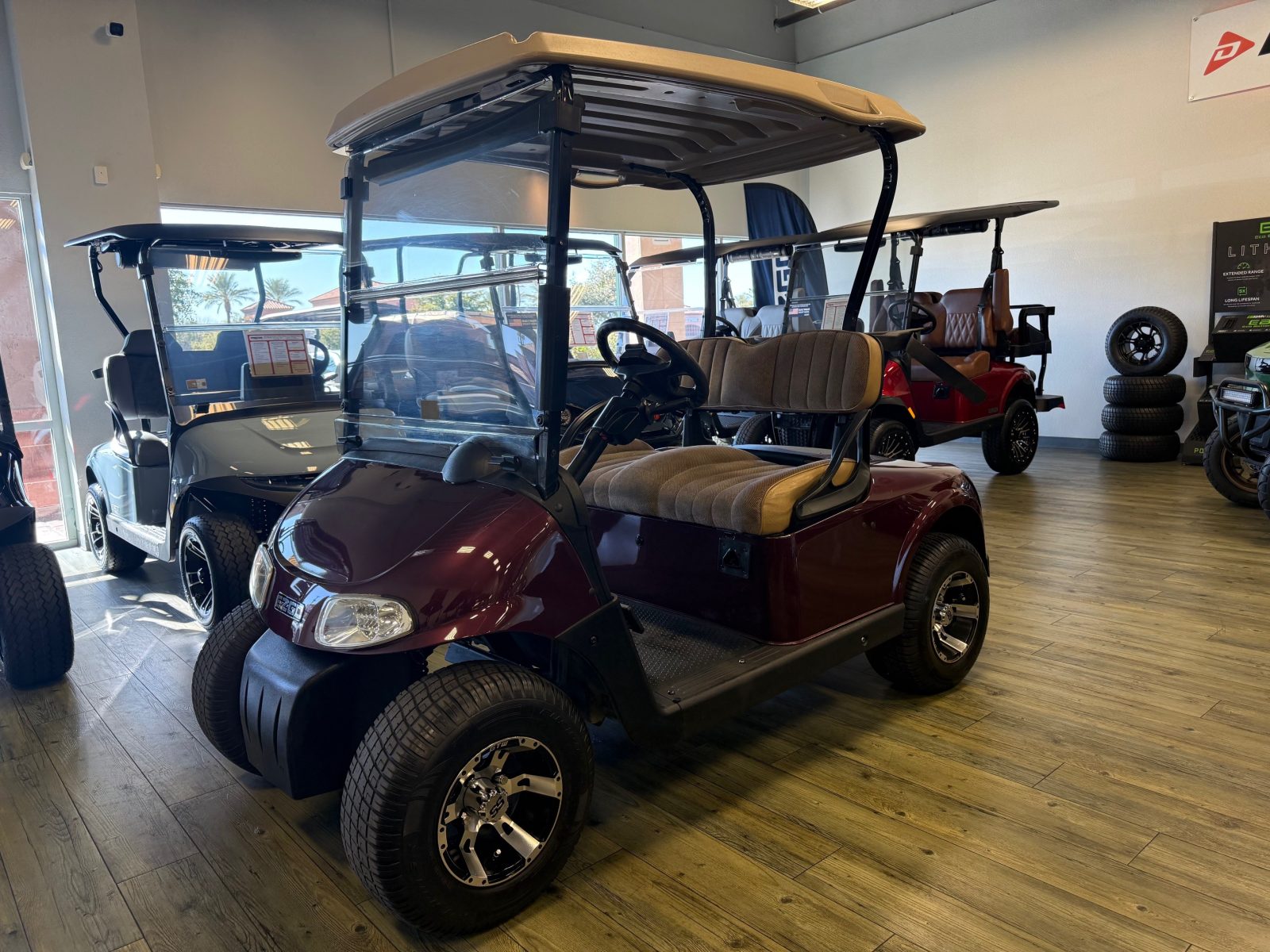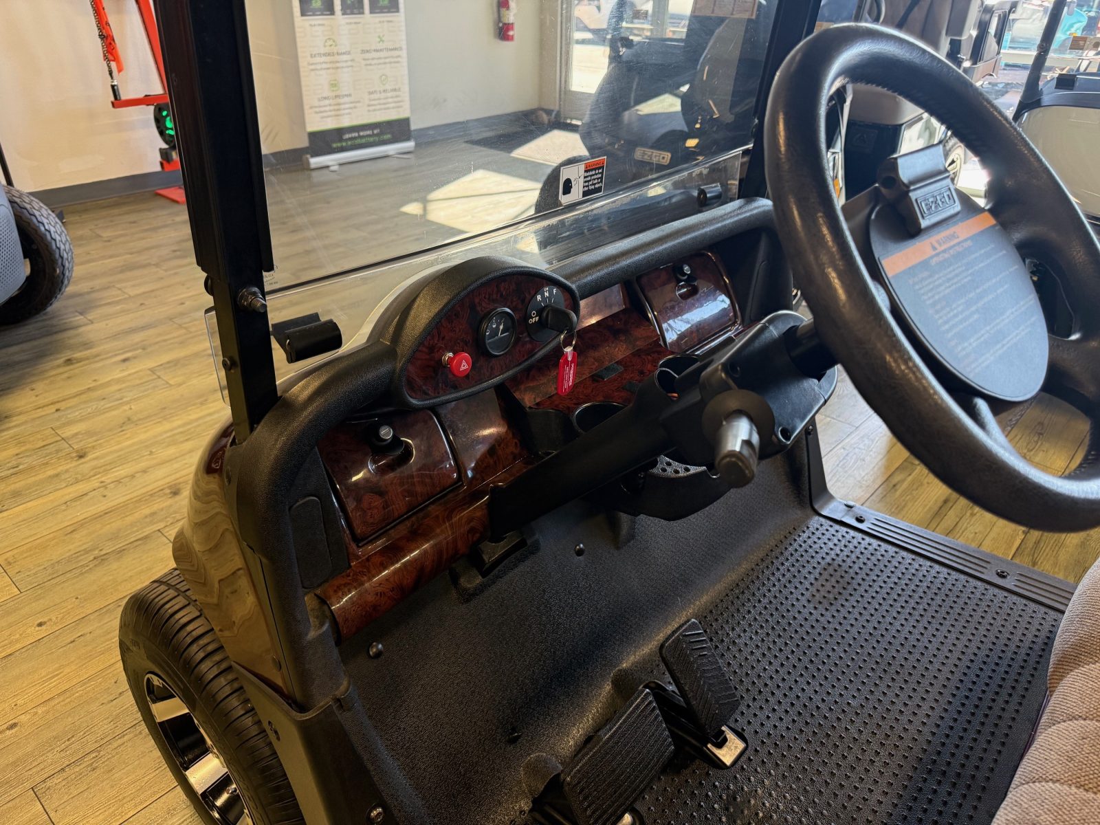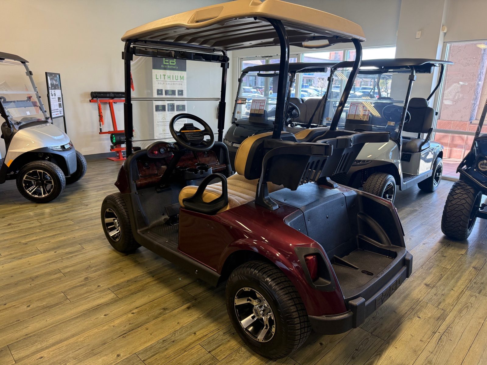 Equipped with AC drive system, new Trojan batteries, upholstered seats, 10″ alloy wheels, burlwood glove box and Mirror.