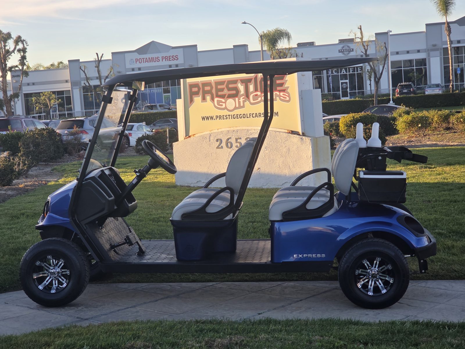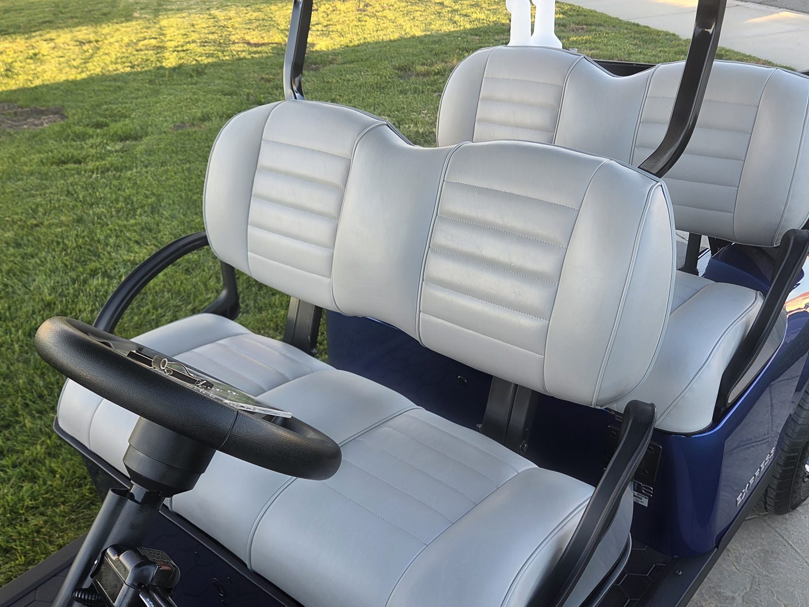 WE WILL NOT BE UNDERSOLD!!! 2025 EZGO EXPRESS L4 FOUR PASSENGER 4.2 LITHIUM GOLF CART. WELL EQUIPPED WITH EXTENDED MODULAR TOP & WINDSHIELD, ELECTRONIC BRAKING SYSTEM, UPGRADED PREMIUM SEATS, UPGRADED CUSTOM 10″ ALLOY WHEELS & TIRES, TURN SIGNALS WITH HORN, LED LIGHTS, CONVEX REAR VIEW MIRROR, PASSENGER SIDE DASH STORAGE COMPARTMENT, LED LIGHTED CUP HOLDERS, SCORECARD CLIP, DUAL USB CHARGING PORTS, DUAL SAND/SEED BOTTLES, COOLER AND SO MUCH MORE. <<< SUPER CLEAN LITHIUM CART READYY FOR ANY COURSE — 1 OWNER LOCAL TRADE >>> FINANCING IS AVAILABLE.
